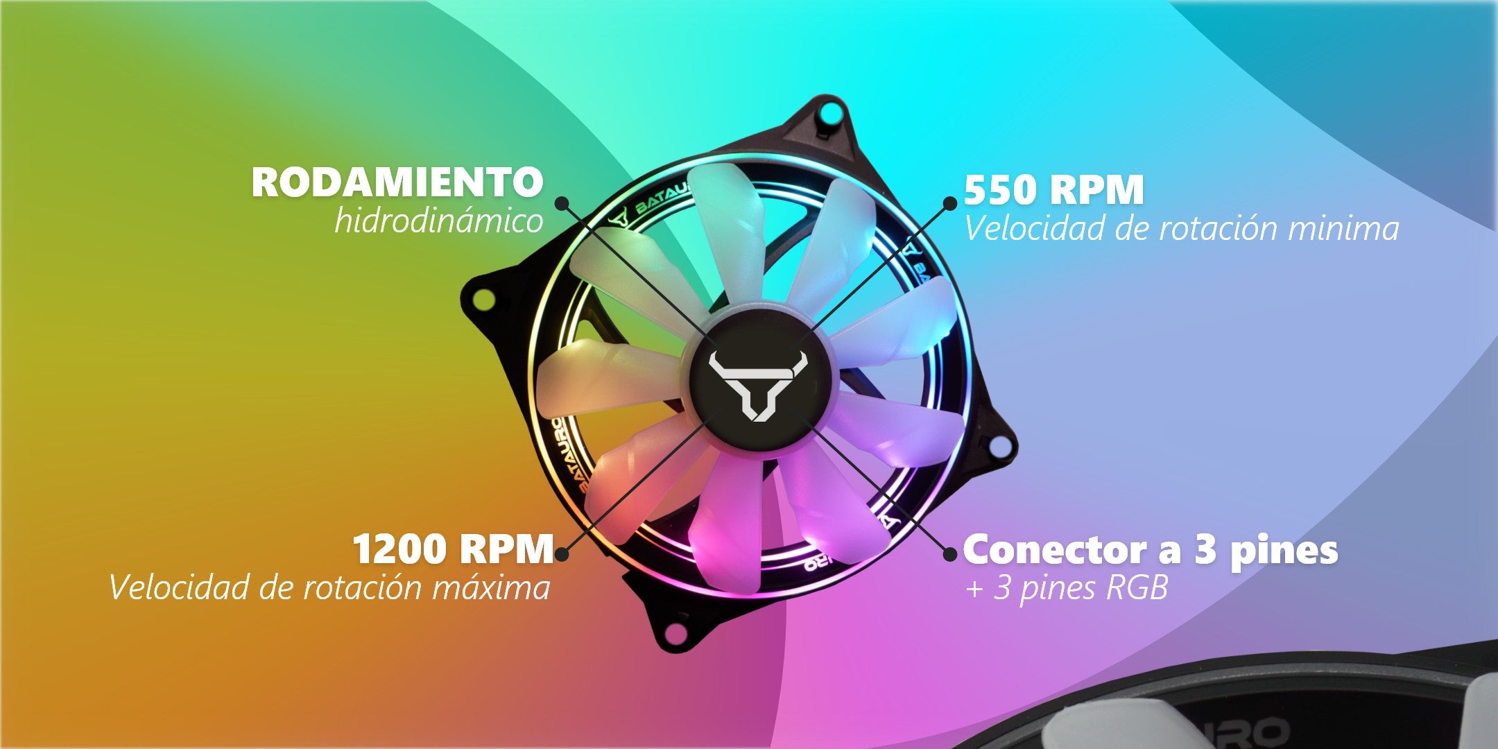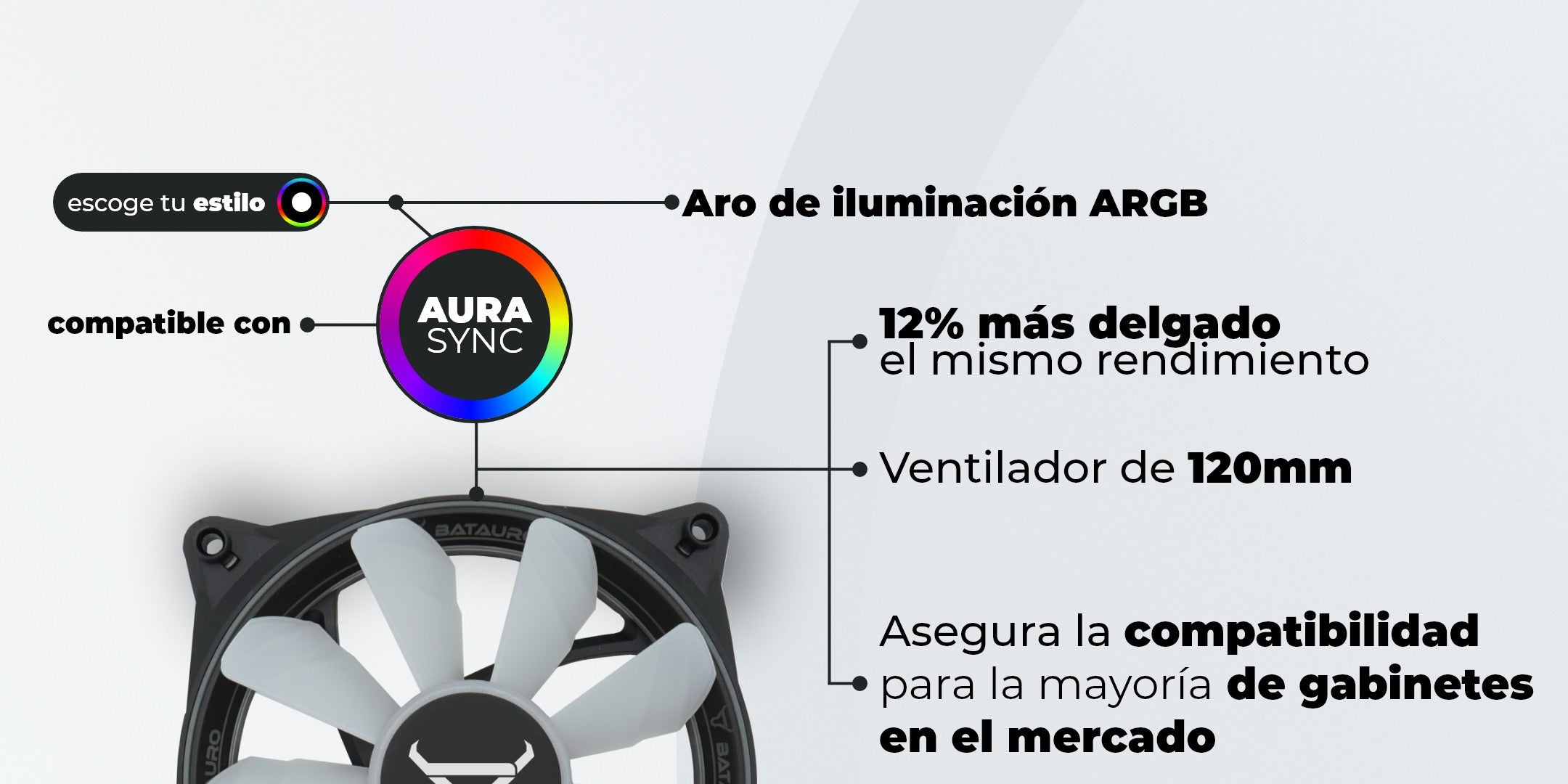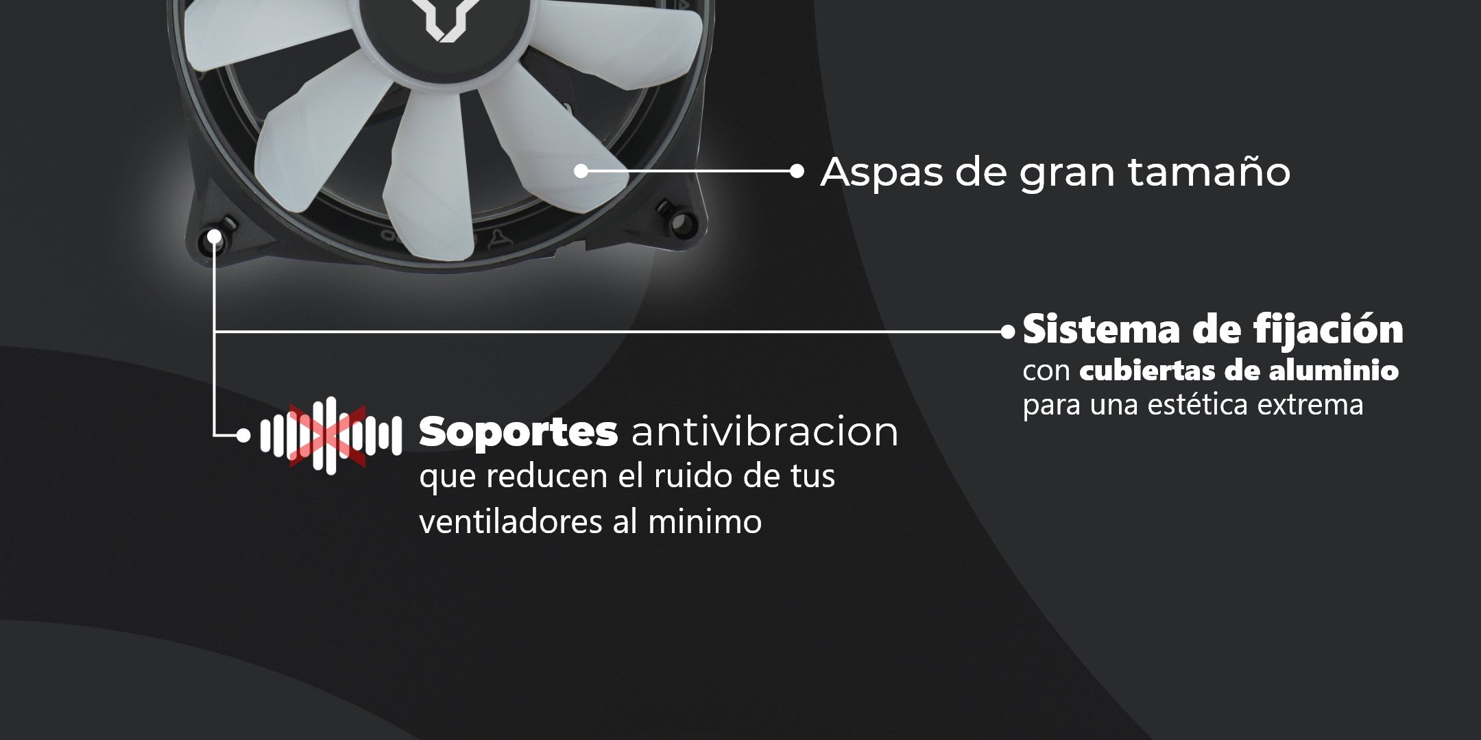 El ventilador de 120 mm para asegurar la compatibilidad para la mayoria de gabinetes en el mercado este cuenta con aspas de gran tamaño suspendidas para blindar un flujo de aire extremo, con sistema de fijacion y cubiertas de aluminio para una estética extrema, es un 12% más delgado en su diseño que el ventilador tradicional manteniendo el mismo rendimiento.