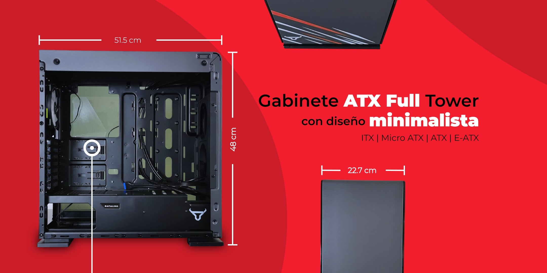 Gabinete ATX Full Tower con diseño minimalista con estructura unibody que envuelve sus paneles laterales de cristal templado de alto calibre.