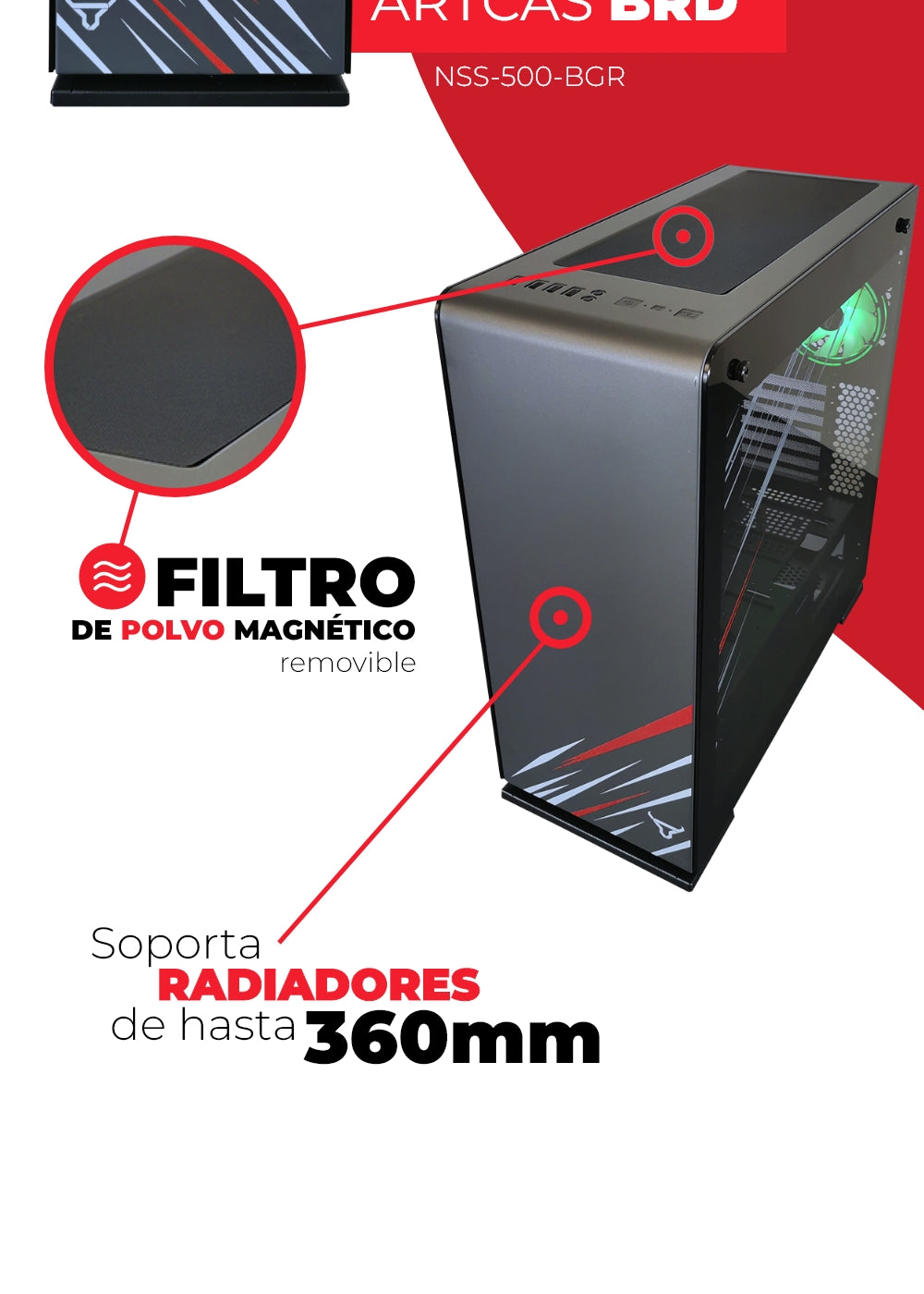 compatibilidad con la sincronización de tu motherboard (ARGB 5V). El gabinete Artcas BGR sabe que el TAMAÑO IMPORTA, Su gran tamaño lo hacen ideal para instalación de sistemas de enfriamiento liquido de alto desempeño soportando radiadores de hasta 360 mm.