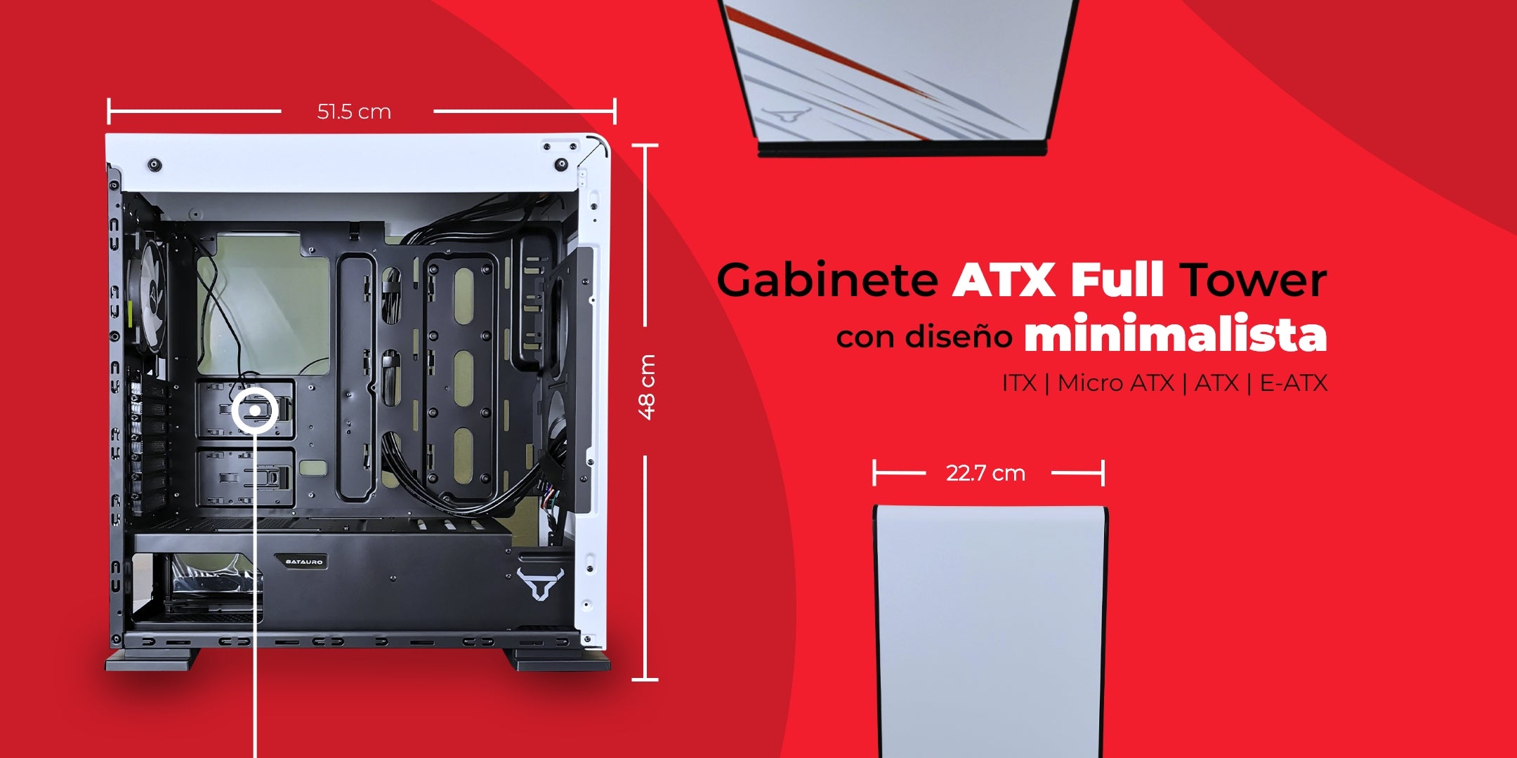 Gabinete ATX Full Tower con diseño minimalista con estructura unibody que envuelve sus paneles laterales de cristal templado de alto calibre.