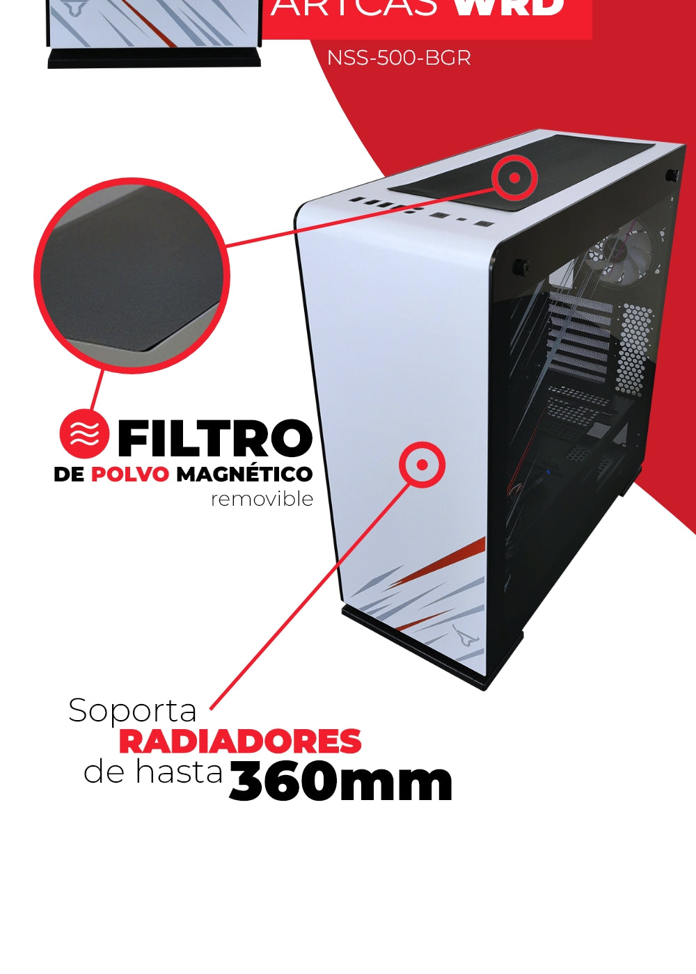 compatibilidad con la sincronización de tu motherboard (ARGB 5V). El gabinete Artcas BGR sabe que el TAMAÑO IMPORTA, Su gran tamaño lo hacen ideal para instalación de sistemas de enfriamiento liquido de alto desempeño soportando radiadores de hasta 360 mm.