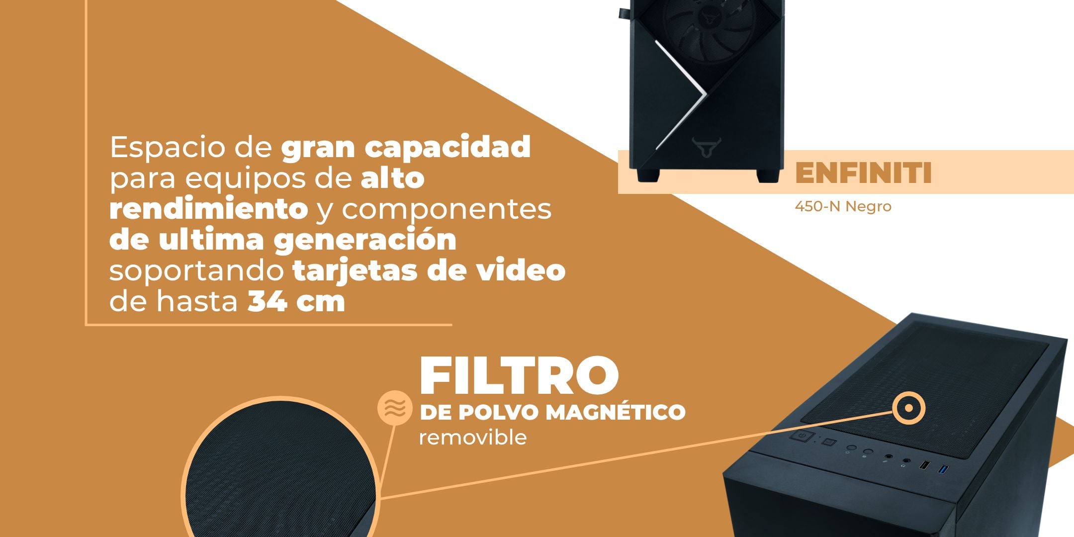 Con el Gabinete Micro ATX / ITX Tower ENFINITI, encontrarás un diseño minimalista con estructura unibody que envuelve sus paneles laterales de cristal templado de alto calibre. Sin dejar pasar de lado su panel frontal y superior fabricado de una robusta pieza de 0.60 - 0.80 mm de grosor, aumentando su estética y minimalismo por completo controlando la iluminación de tu equipo gracias al controlador ARGB integrado con botón de administración en panel frontal y compatibilidad con la sincronización de tu motherboard (ARGB 5V). El gabinete ENFINITI sabe que el TAMAÑO IMPORTA, Su gran tamaño lo hacen ideal para instalación de sistemas de enfriamiento liquido de alto desempeño soportando radiadores de hasta 240 mm. Aparte ahora cuenta con un fuente Batauro 450W 80 PLUS Bronze para poder sumistrar la energia necesaria a tus componnetes y asi tener un gabiente super completo para diferentes entornos.