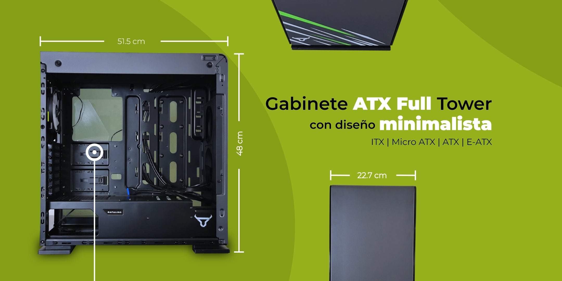 Gabinete ATX Full Tower con diseño minimalista con estructura unibody que envuelve sus paneles laterales de cristal templado de alto calibre.