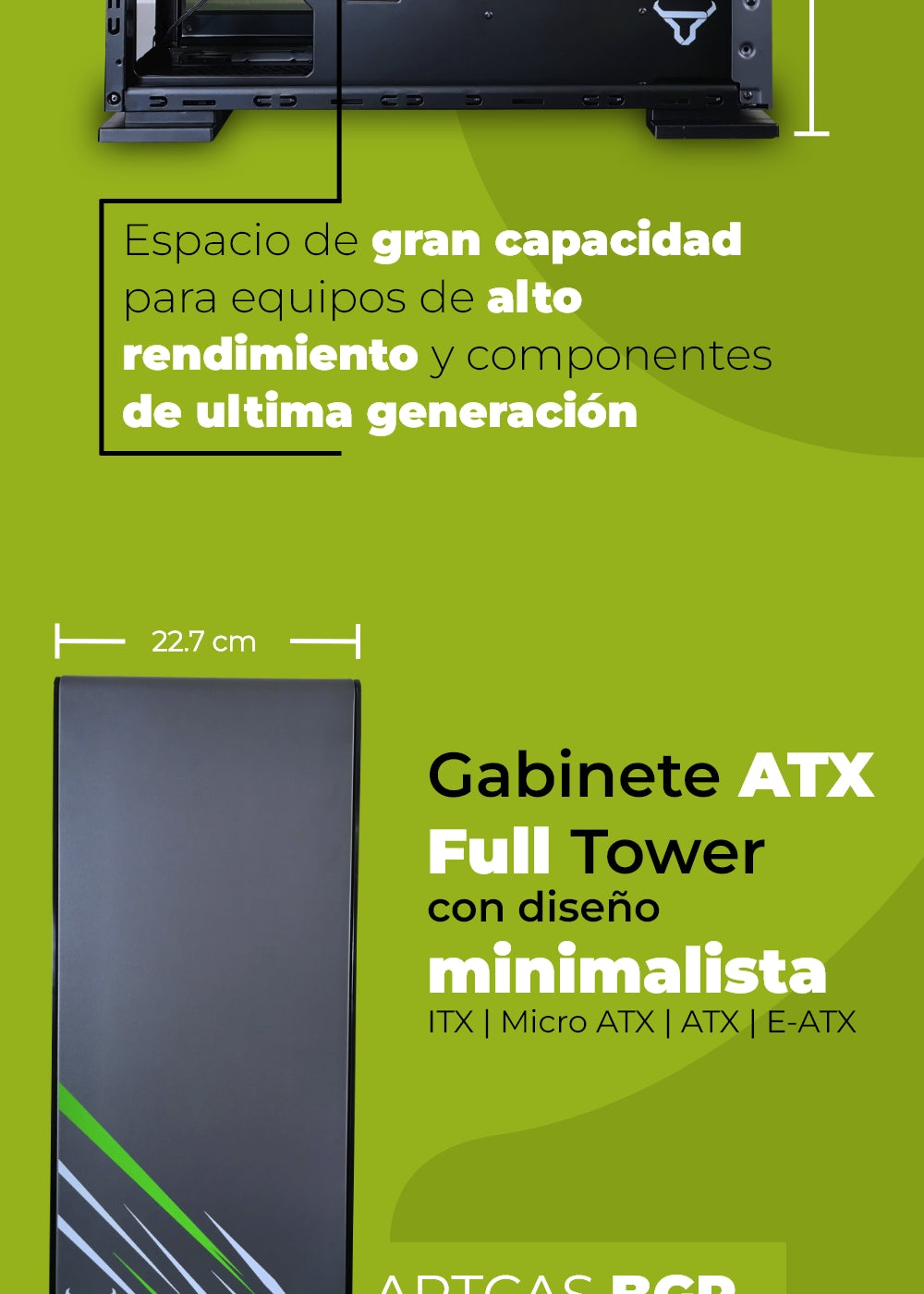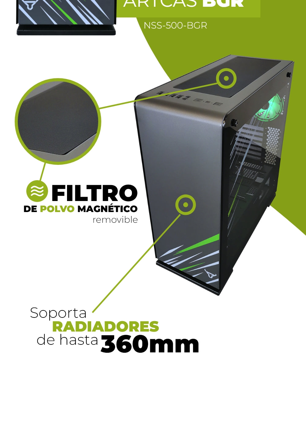 compatibilidad con la sincronización de tu motherboard (ARGB 5V). El gabinete Artcas BGR sabe que el TAMAÑO IMPORTA, Su gran tamaño lo hacen ideal para instalación de sistemas de enfriamiento liquido de alto desempeño soportando radiadores de hasta 360 mm.