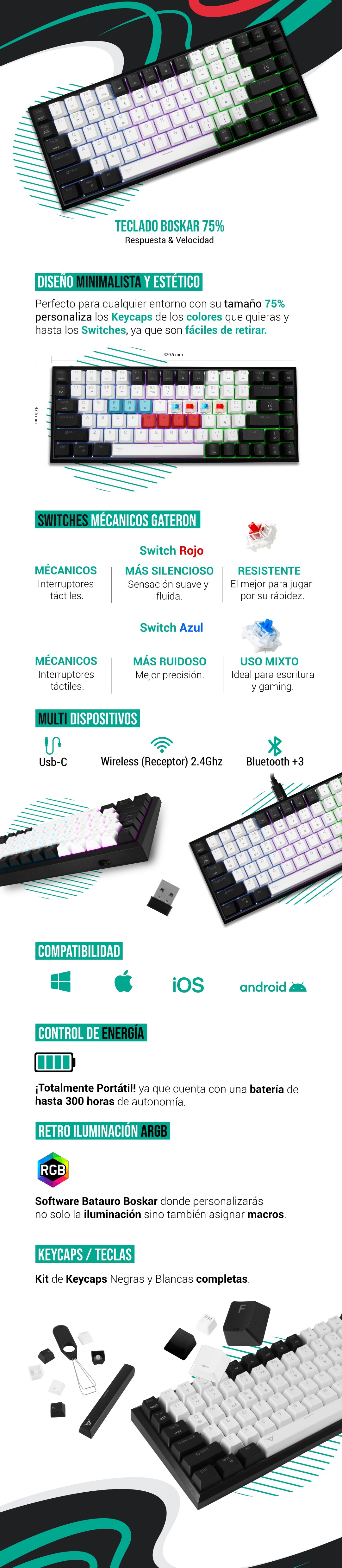 Boskar - Teclado Gamer Batauro Mecánico 75% Switch Blue Bluetooth Azules